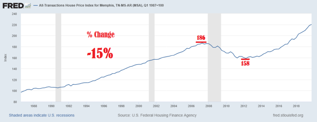Như chúng ta có thể thấy, Memphis đã vượt qua cơn bão một cách khá thận trọng. Hơn nữa, vì giá không giảm quá nghiêm trọng trong cuộc khủng hoảng tài chính, giá ở Memphis hiện đã vượt quá mức cao trước khủng hoảng tài chính rất nhiều, trong khi giá ở New York và Miami vẫn chưa phục hồi hoàn toàn. Nhìn lại xa hơn, chúng ta cũng có thể thấy sự biến động về giá cả ở San Francisco, Los Angeles và Thành phố New York sau cuộc suy thoái năm 1987, trong khi Memphis đã chứng kiến sự tăng trưởng ổn định cho đến khi cuộc Đại suy thoái bắt đầu giữ vững vào năm 2007 .