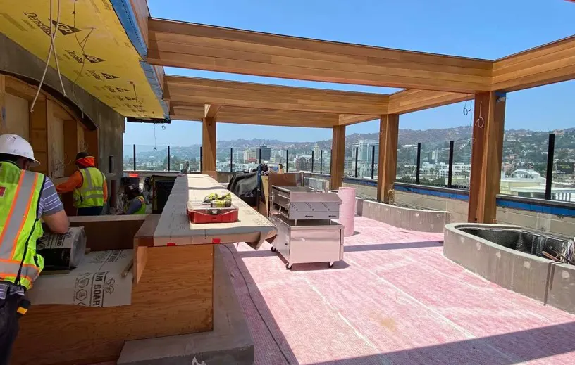 Tommie Hotel is a 9-story (106,368 SF) hotel over 4 levels  (79,332 SF) and 173 stalls of subterranean valet parking.  The project is a type 1-B, fully sprinklered (NFPA 13) high rise building, with 212 hotel guest rooms, a ground floor anchor restaurant and courtyard “Ka’Teen”, a rooftop deck and bar “Desert 5 Spot”, and a roof pool. Ka’teen will serve Latin-American-inspired dishes and cocktails in a lush setting reminiscent of Old Tulum, while Desert Five Spot will provide an ambiance inspired by Palm Springs in the 70’s.